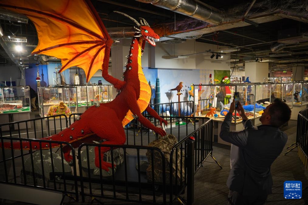 10月3日,参观者在波兰华沙举行的乐高积木展上拍摄巨龙模型。