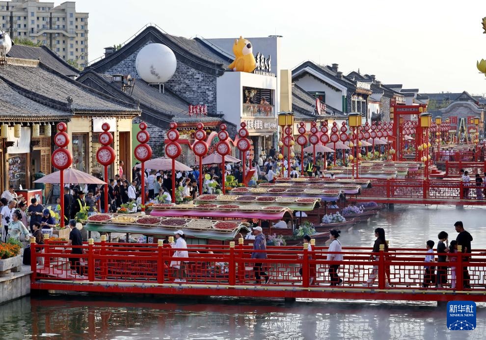 10月3日,游客在河北省唐山市丰南区河头老街景区游玩。