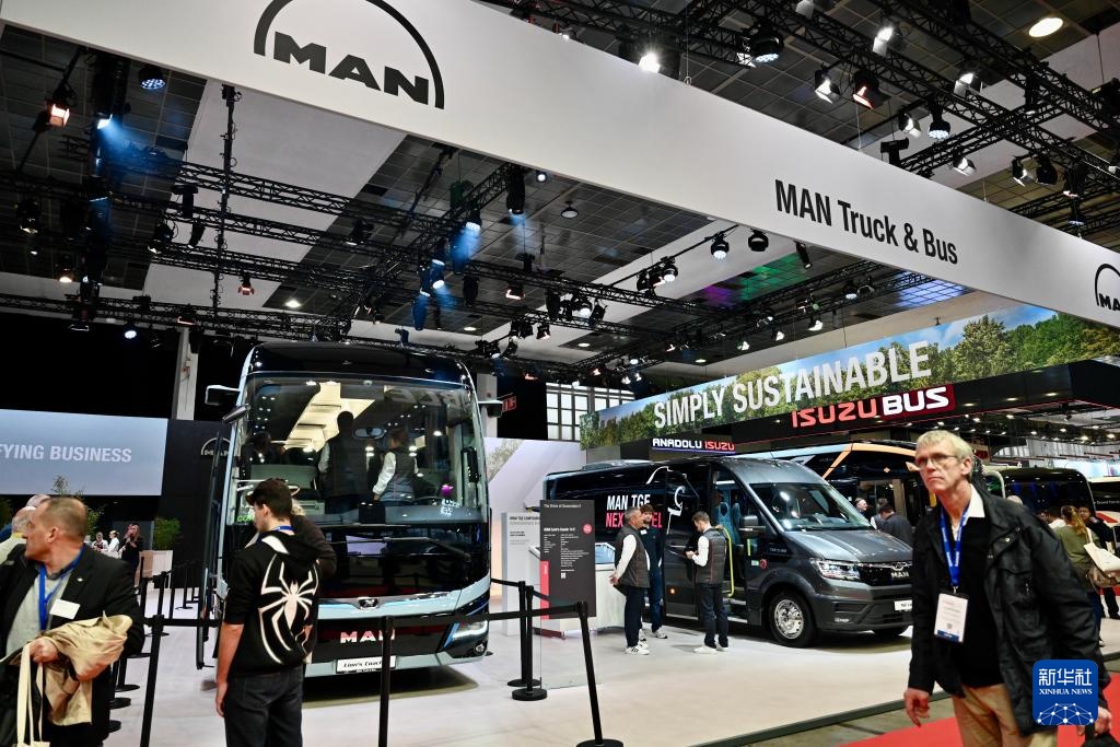 10月4日,在比利时布鲁塞尔举行的世界客车博览会上,参观者经过曼恩展台。