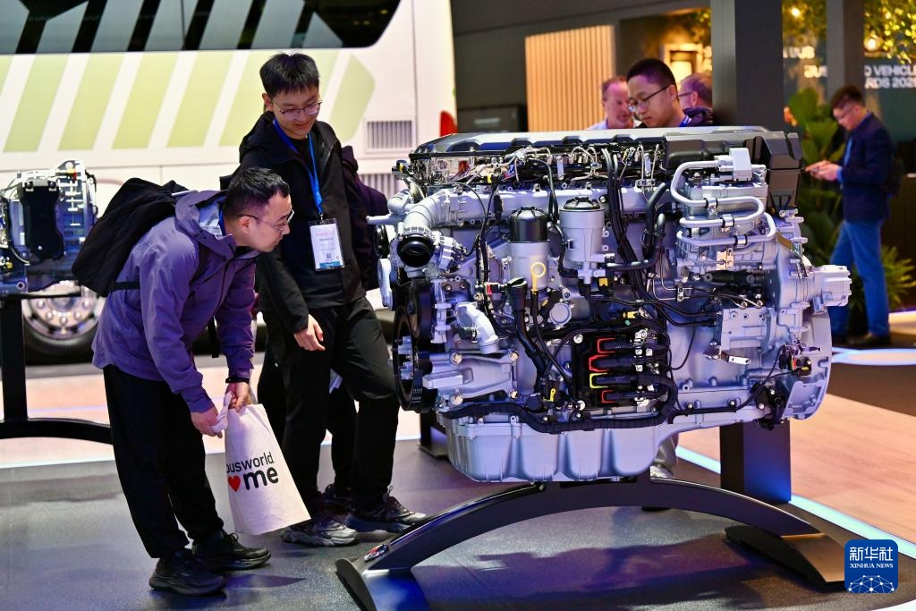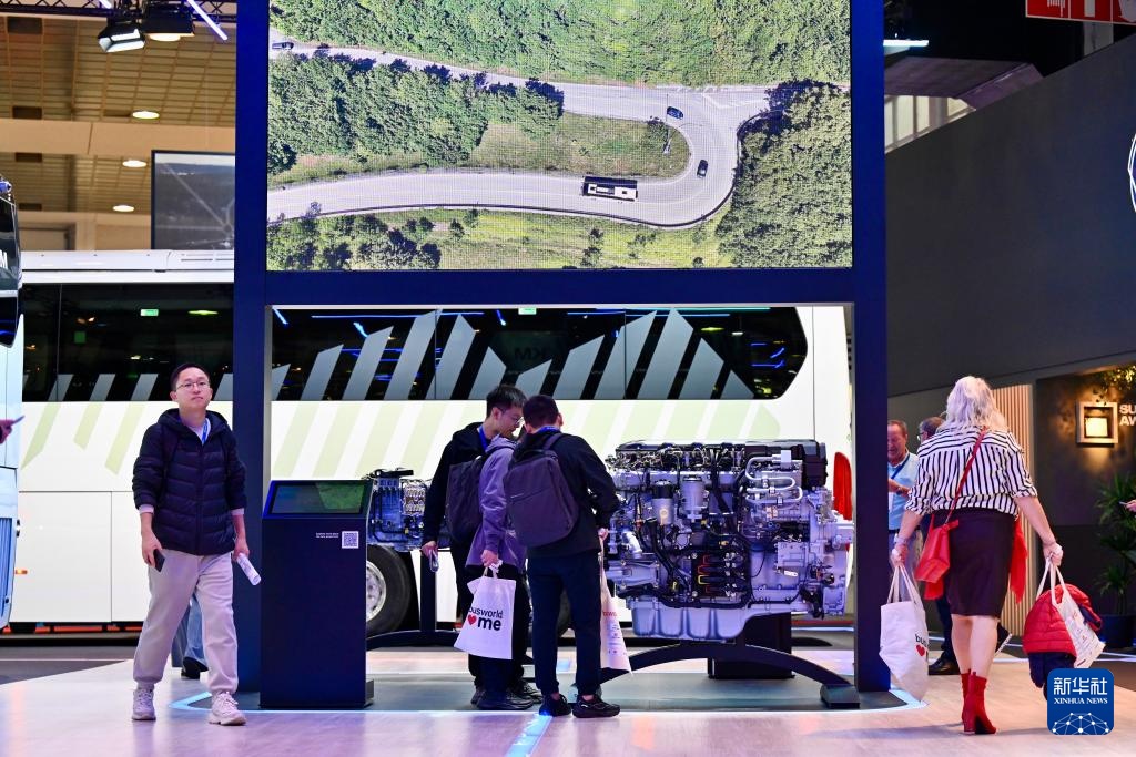 10月4日,在比利时布鲁塞尔举行的世界客车博览会上,参观者在斯堪尼亚展台观看一款核心装置展品。