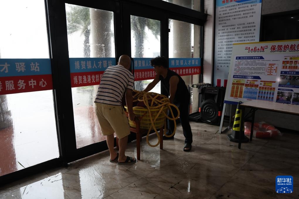 10月5日,在广东省茂名市电白区博贺渔港党群服务中心,工作人员用重物顶住房门。