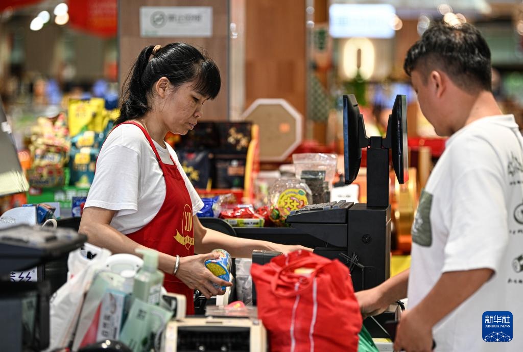 10月6日,在海南文昌一家超市,工作人员为顾客结算商品。