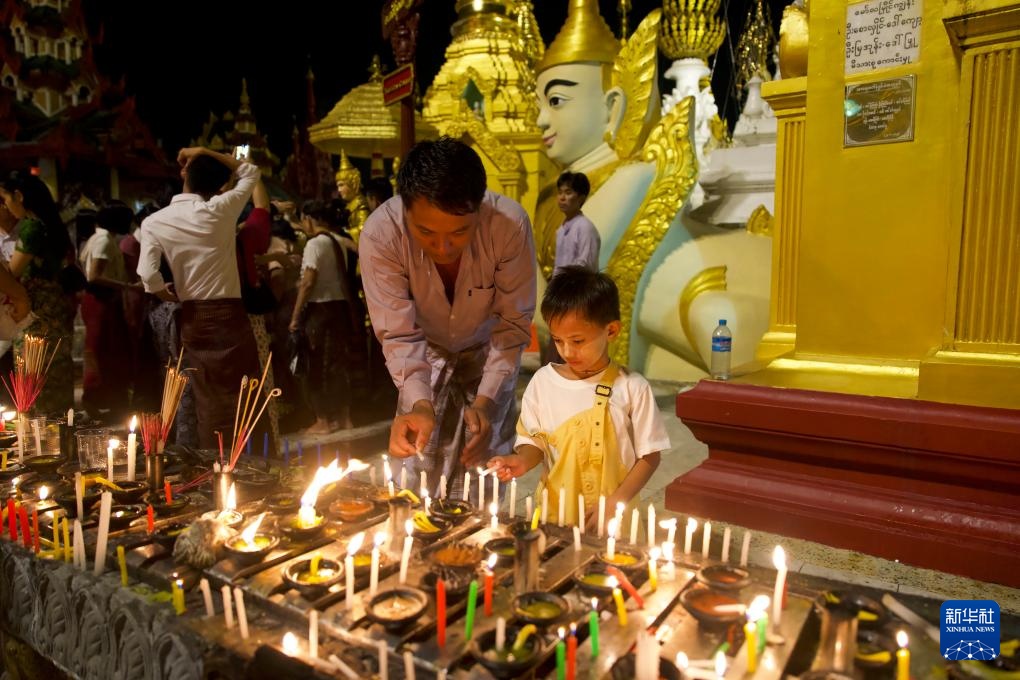 10月6日,民众在缅甸仰光大金塔点燃蜡烛庆祝点灯节。新华社记者 黎广滔 摄