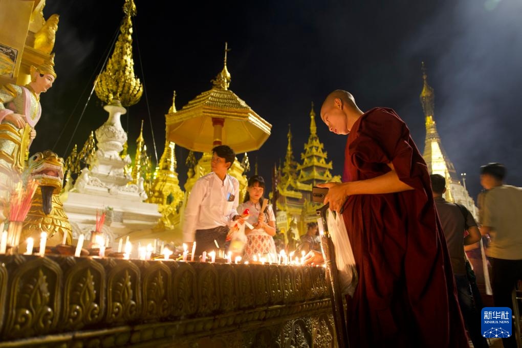 10月6日,一名僧侣在缅甸仰光大金塔点燃蜡烛庆祝点灯节。新华社记者 黎广滔 摄pagebreak