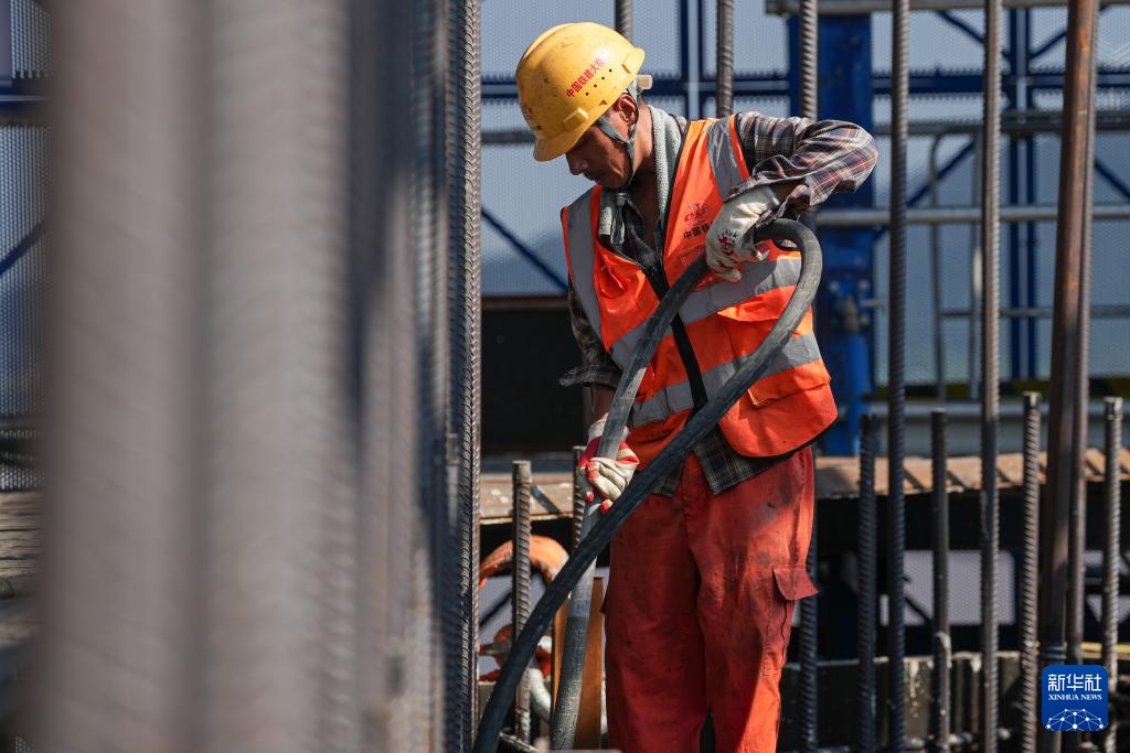10月6日,建设者在甬舟铁路桃夭门公铁两用大桥6号主塔进行施工作业。