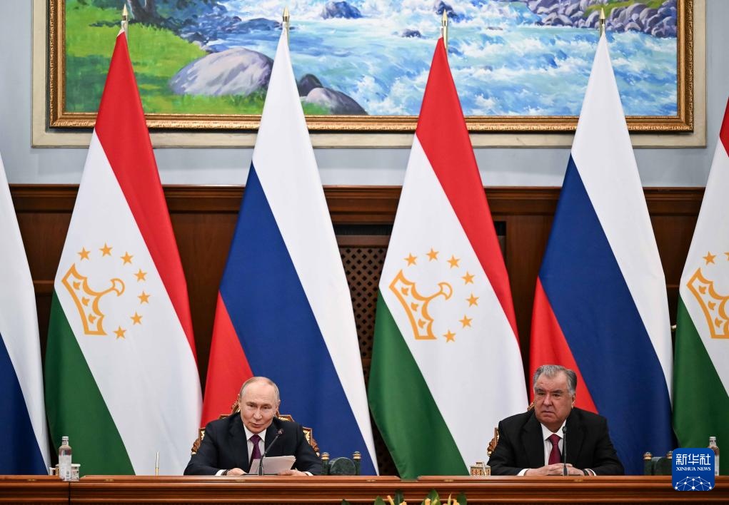 10月9日,在塔吉克斯坦首都杜尚别,俄罗斯总统普京(左)和塔吉克斯坦总统拉赫蒙共同出席联合记者会。