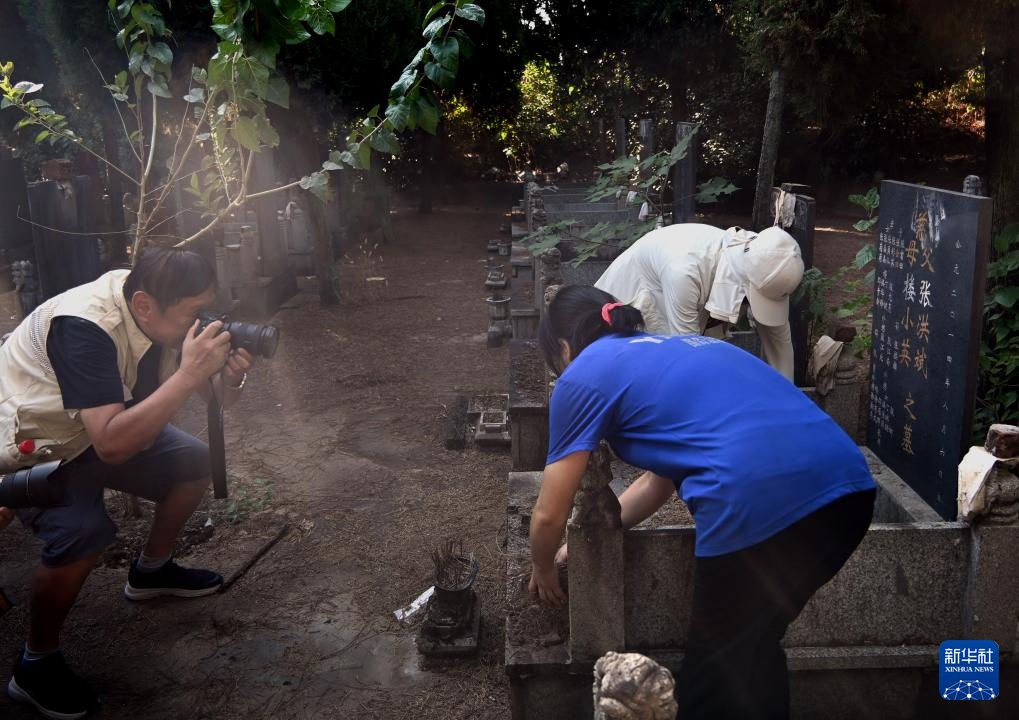 10月11日,在浙江省金华市的一处公墓,被张洪斌夫妇抚养长大的张菊菊(前)和另一名当年被张氏夫妇抚养长大的孩子清理两位老人的墓碑,李晓果在旁边拍摄。
