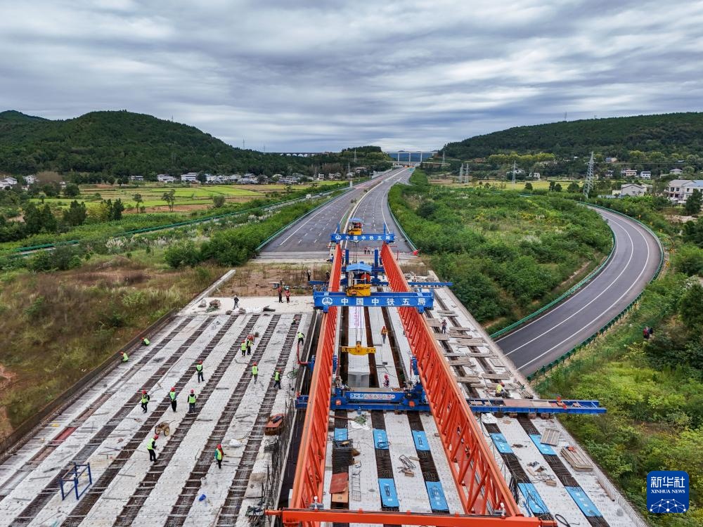 这是10月12日拍摄的京昆高速广元至绵阳段扩容工程牛头河大桥架梁作业现场(无人机照片)。