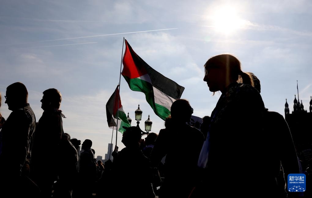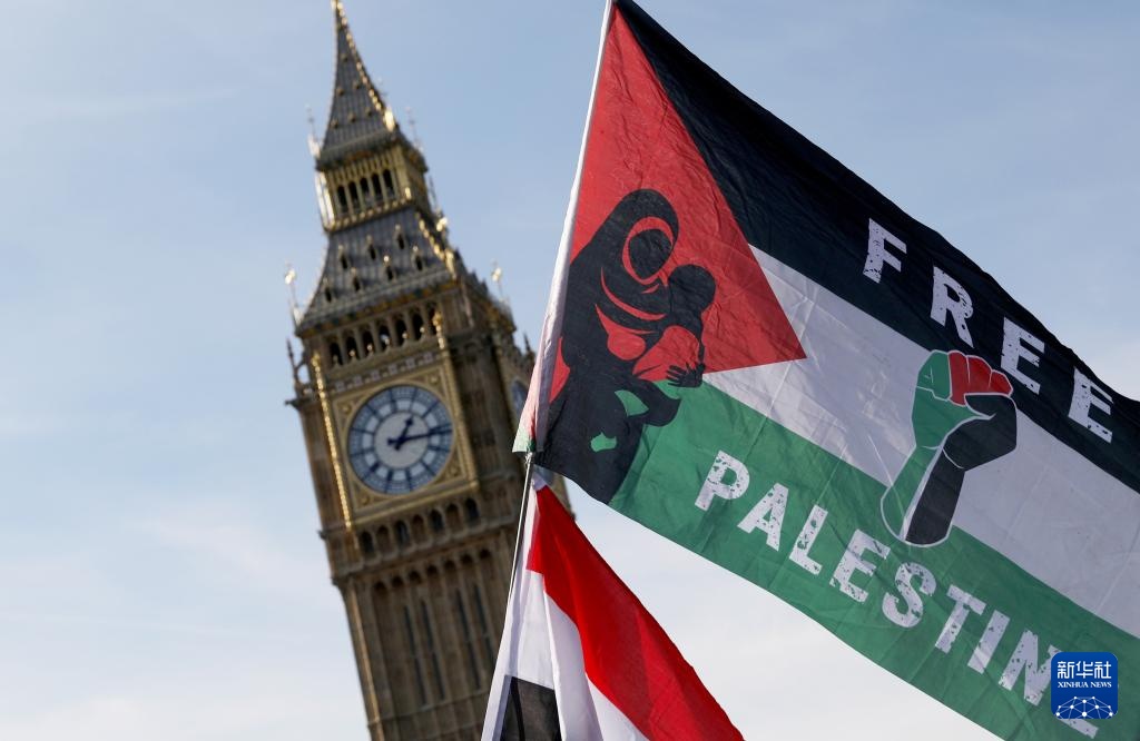 当日,英国民众在伦敦举行游行活动声援巴勒斯坦,呼吁加沙实现持久和平。