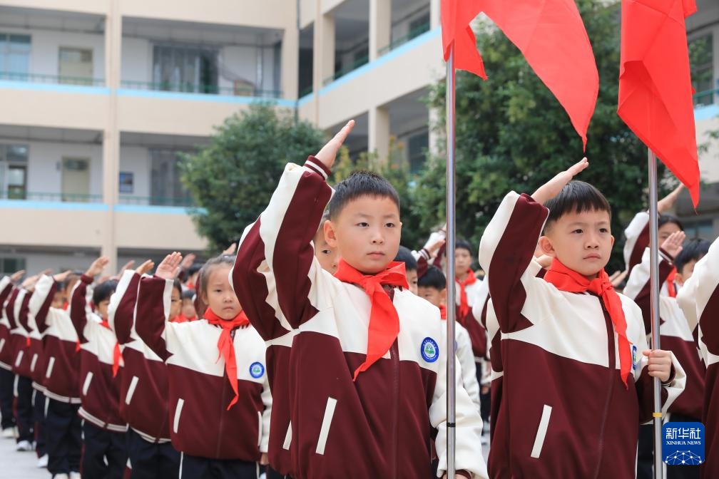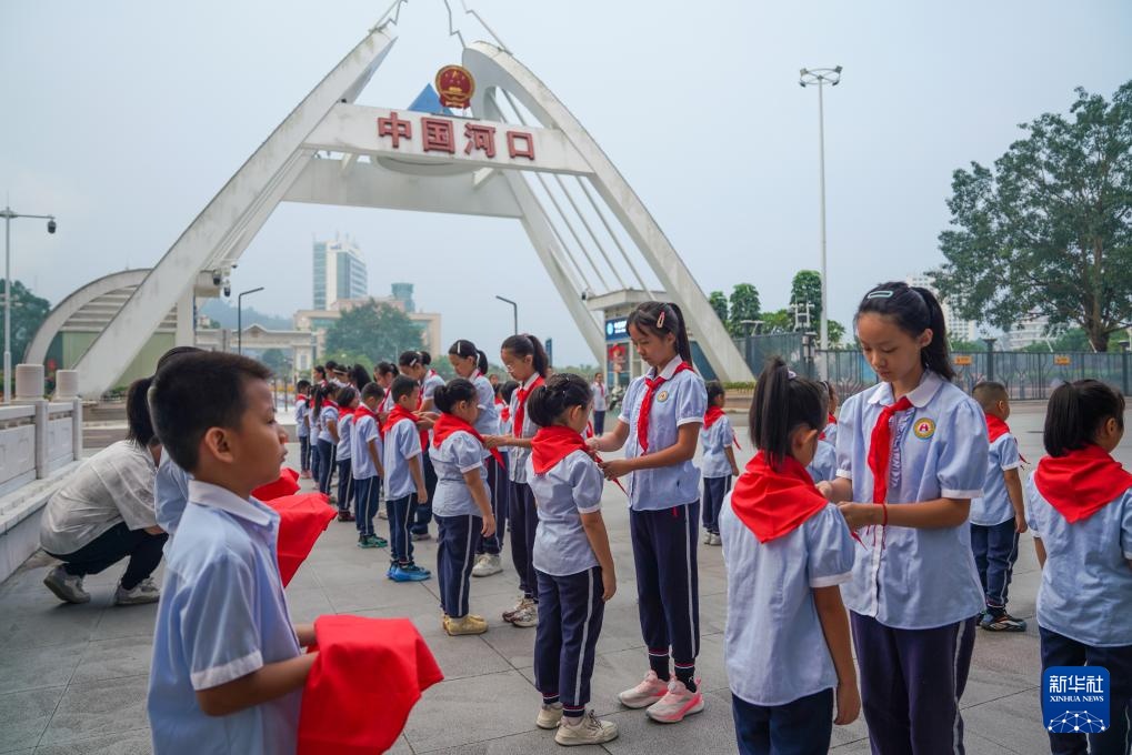 10月13日,在云南省红河州河口县,河口国门小学少先队老队员集体为新队员佩戴红领巾。