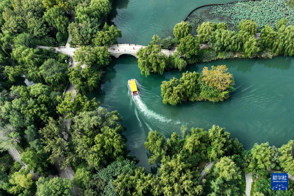 10月13日拍摄的山东省济南市大明湖秋色(无人机照片)。