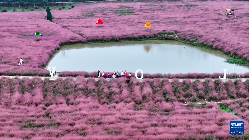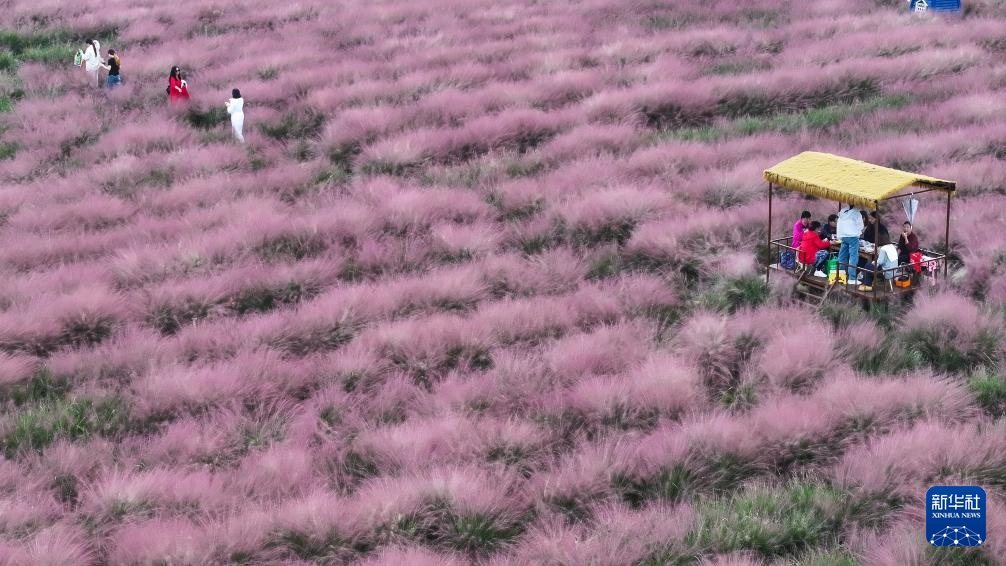 10月13日,游客在江苏省仪征市长兴农场的粉黛花海中游玩(无人机照片)。