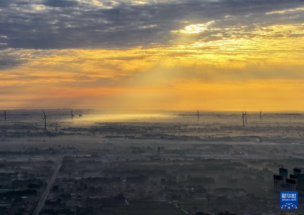 10月13日拍摄的晨雾中的河北省邢台市广宗县俯瞰图(无人机照片)。
