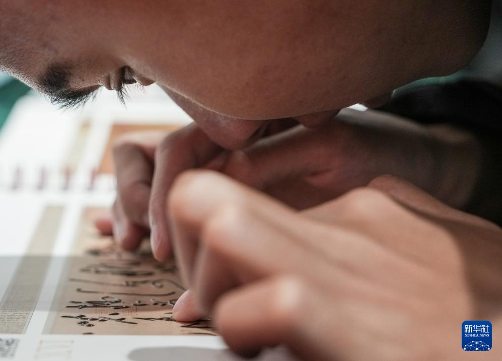 10月13日,视障人士在发布会后,欣赏无障碍版《触摸故宫珍宝》中的黄庭坚草书《诸上座帖》。
