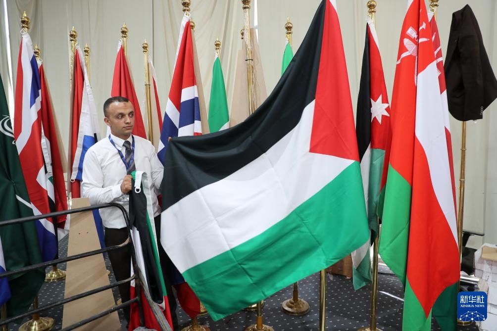 10月13日,在埃及沙姆沙伊赫,一名工作人员在沙姆沙伊赫峰会的媒体中心整理巴勒斯坦国旗。