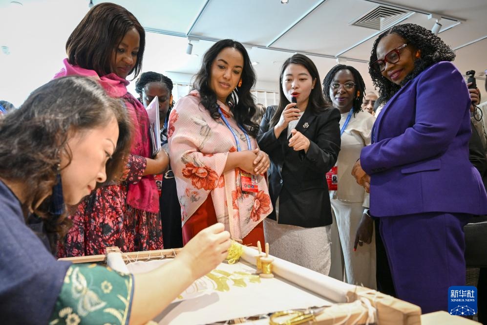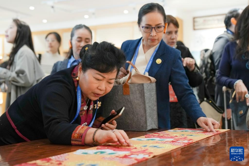 10月14日,全球妇女峰会参会嘉宾在北京市秀水街大厦参访。这是嘉宾在了解京绣。