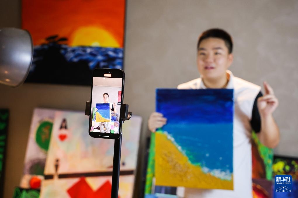 8月8日,王剑书在北京的画室录制视频,向网友介绍自己的作品。