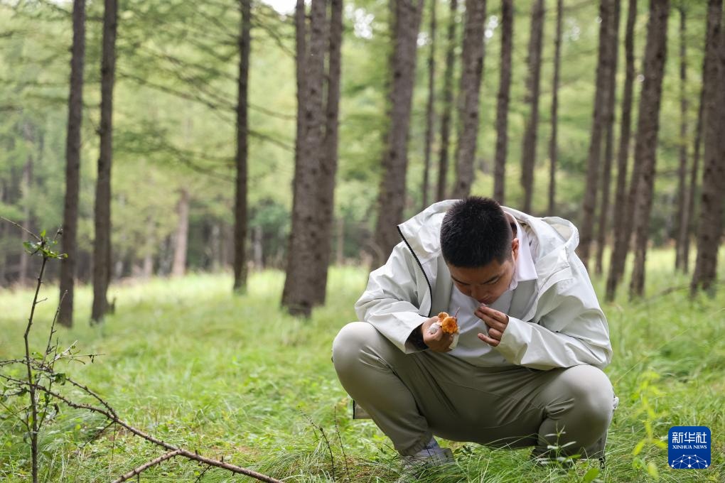 8月17日,王剑书在河北承德御道口草原森林里采蘑菇。