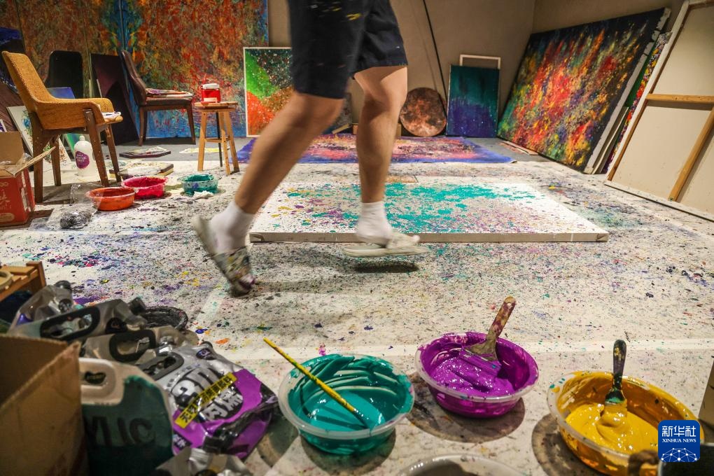 8月8日,王剑书在北京的画室创作滴洒画时,开心得跳起来。