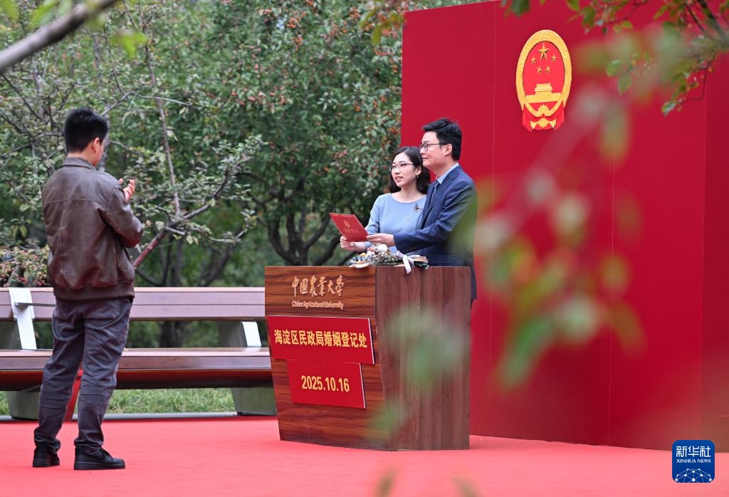 10月16日,一对新人于校庆日当天在中国农业大学东校区的临时婚姻登记点登记结婚。