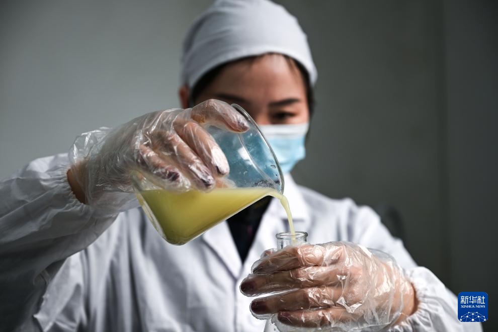 10月16日,在望谟县蔗香镇青柠檬现代产业园,工作人员对柠檬原汁进行初步检测。