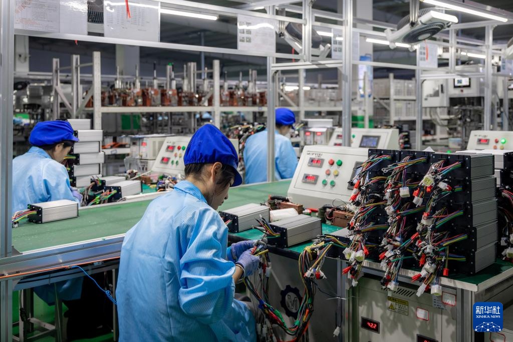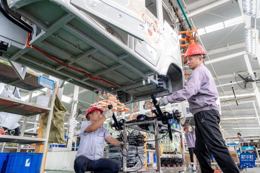 10月16日,在江苏省徐州市丰县电动车生产企业车间内,工人在组装电动三轮车配件。