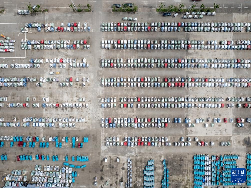 在江苏省徐州市丰县电动车生产企业内拍摄的准备发货的电动三轮车(无人机照片,10月16日摄)。