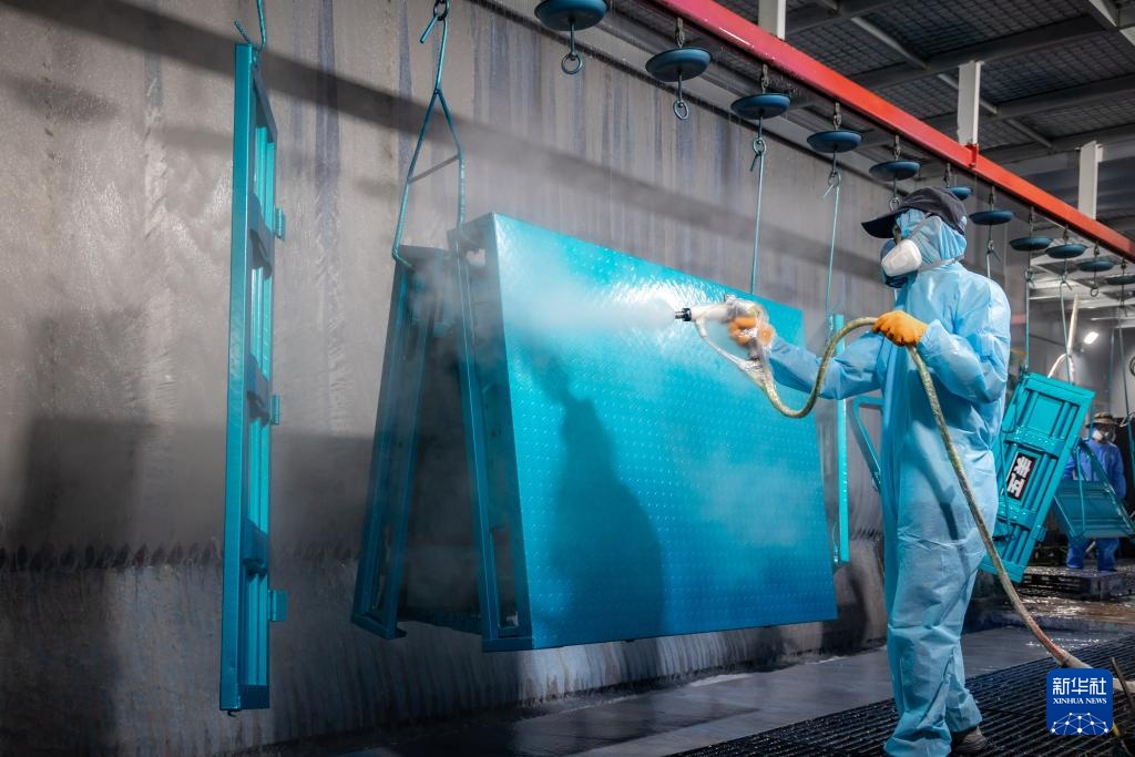 10月16日,在江苏省徐州市丰县电动车生产企业车间内,工人在喷涂电动三轮车配件。