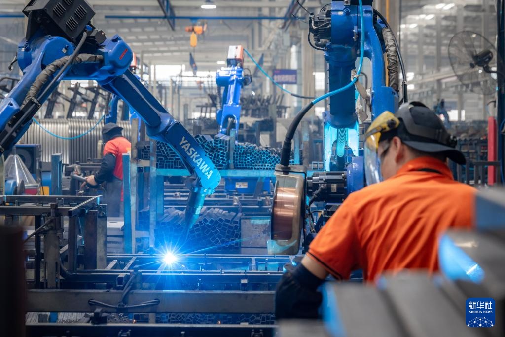 10月16日,在江苏省徐州市丰县电动车生产企业车间内,工人在焊接电动三轮车配件。