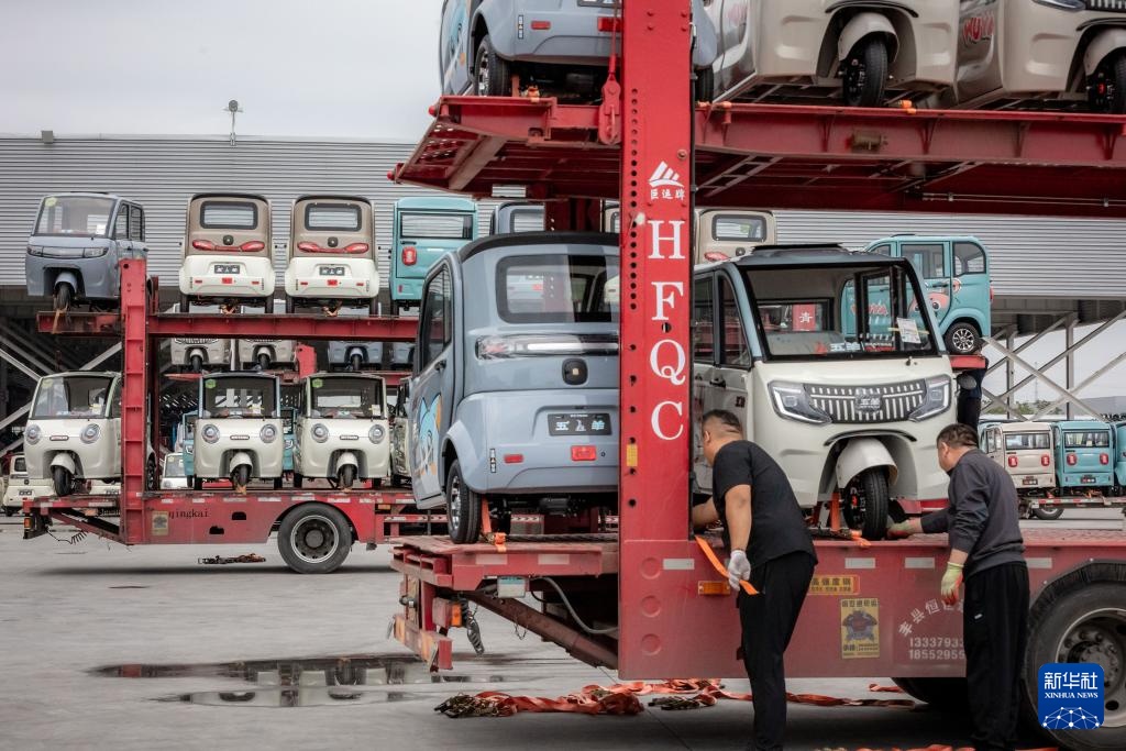 10月16日,在江苏省徐州市丰县电动车生产企业停车场内,工人将电动三轮车装车发货。
