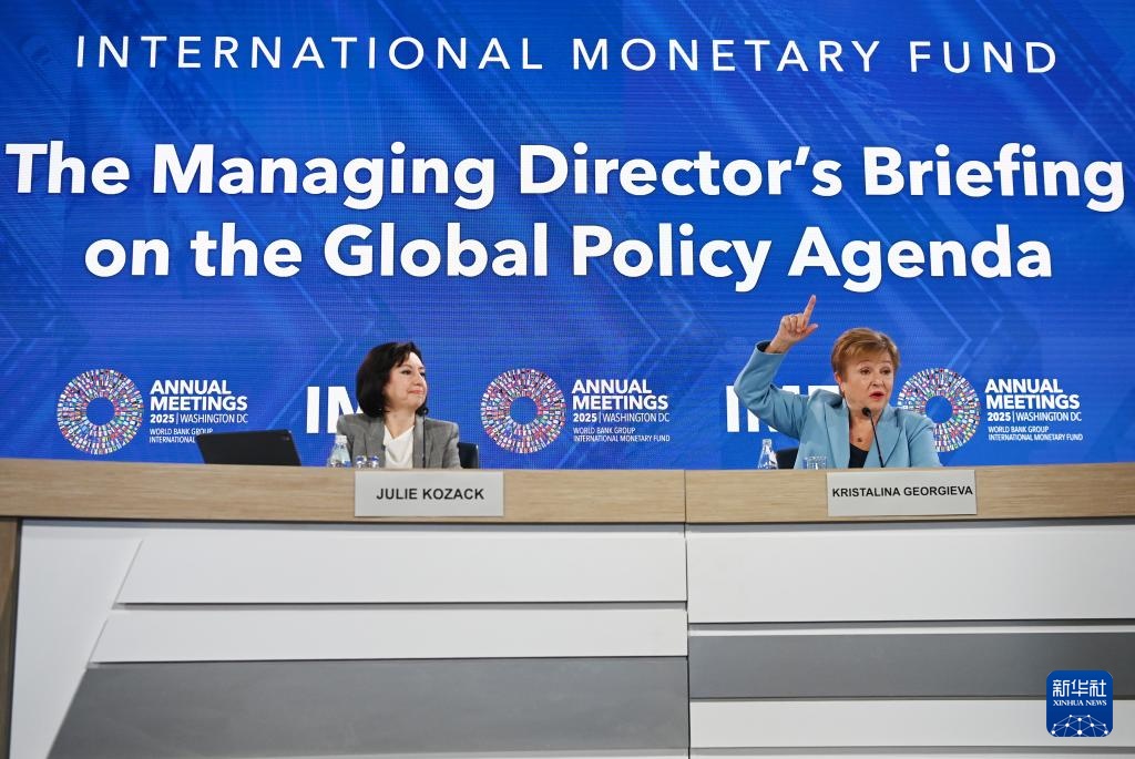 10月16日,在美国华盛顿,国际货币基金组织(IMF)总裁格奥尔基耶娃(右)在新闻发布会上讲话。