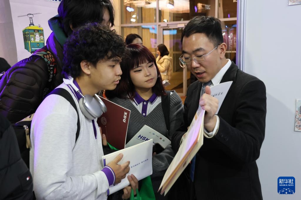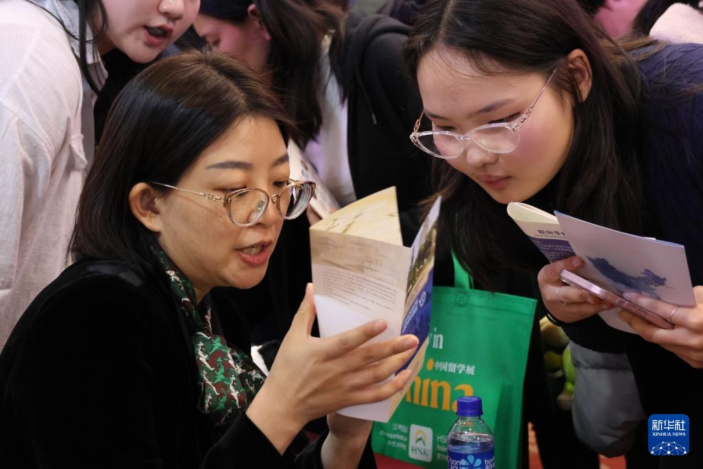 10月16日,在蒙古国乌兰巴托市,学生在蒙古国第二届HSK留学中国展现场咨询。