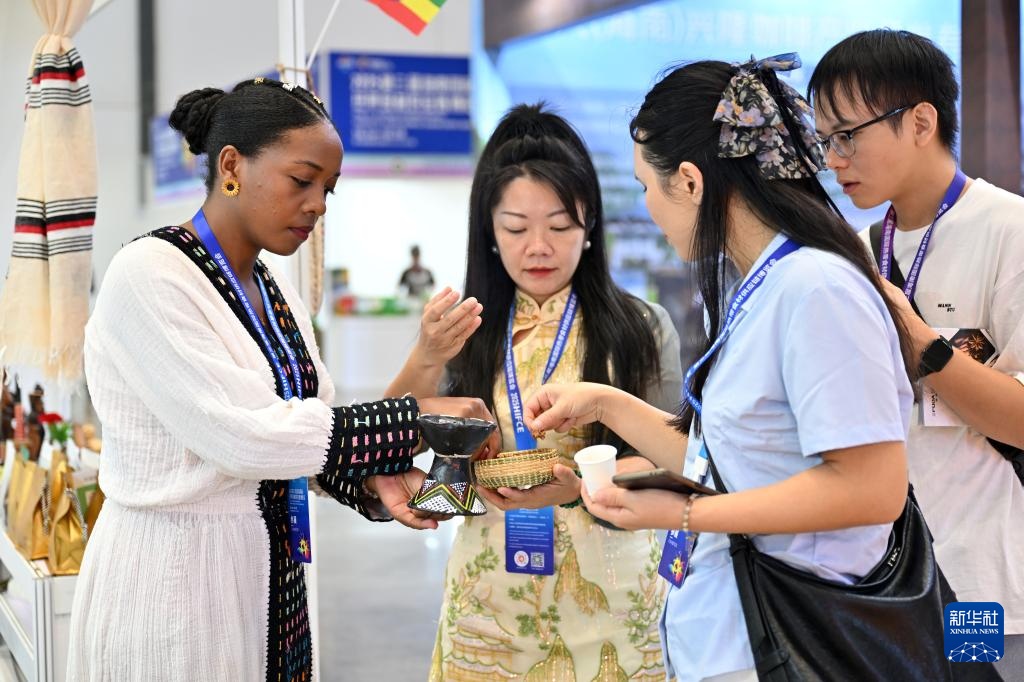 10月17日,展商(左一、左二)向参观者介绍埃塞俄比亚咖啡豆。