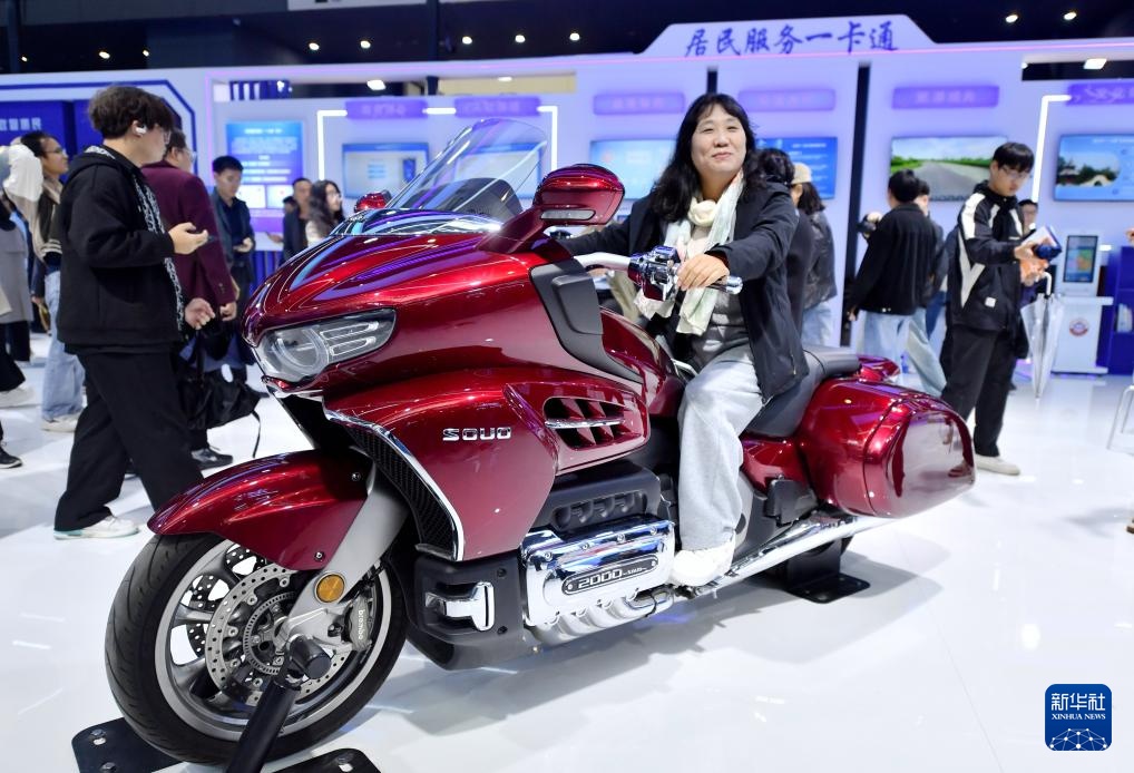 10月17日,观众在博览会上体验国产摩托车。