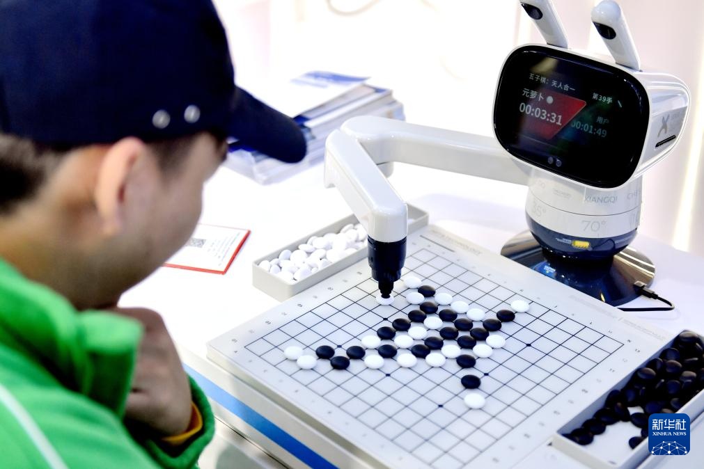 10月17日,观众在博览会现场与下棋机器人下五子棋。