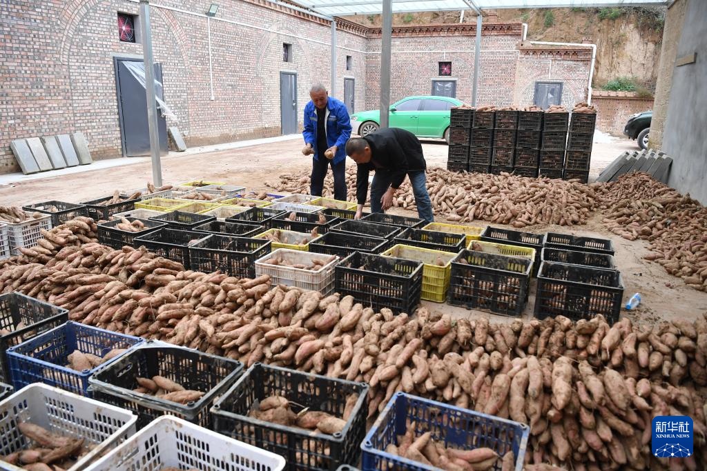 10月16日,延安市宝塔区甘谷驿镇罗家湾村村民在整理收获的红薯。
