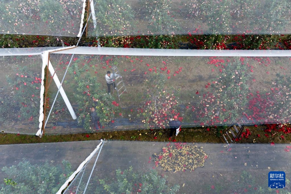 10月17日,果农在延安市宝塔区桥沟街道烟洞沟村苹果园内摘掉苹果套袋(无人机照片)。