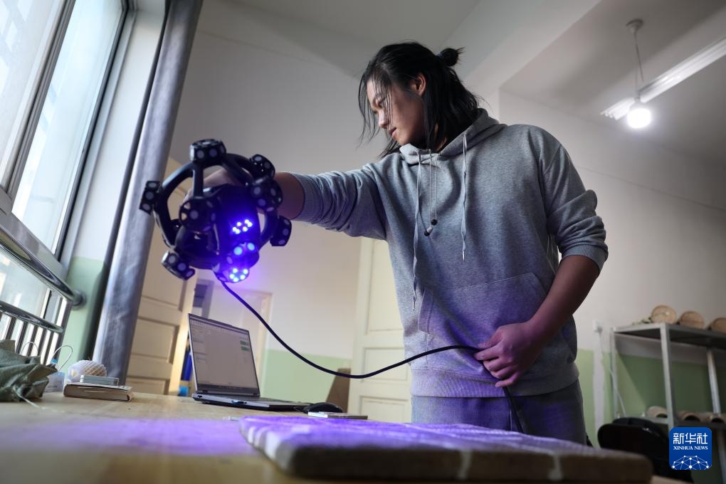 10月15日,技术人员杜言在四角坪遗址考古队驻地对出土文物进行数字化扫描。