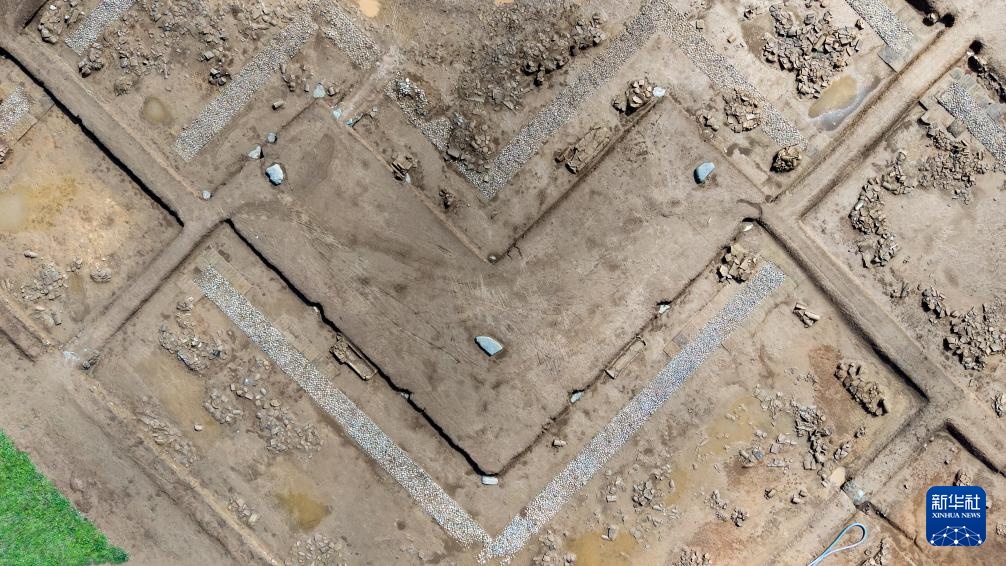 这是10月15日在甘肃省陇南市礼县四角坪遗址考古发掘现场拍摄的一处曲尺形建筑遗迹(无人机照片)。