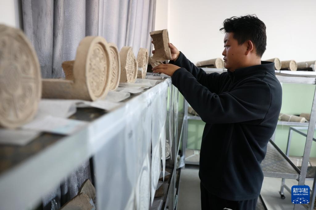 10月15日,甘肃省文物考古研究所助理馆员段涛在四角坪遗址考古队驻地整理出土文物。