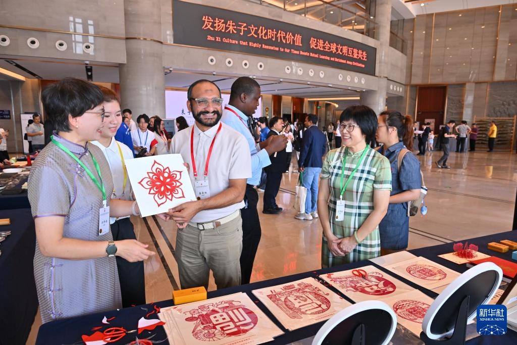 10月18日,“朱子学与全球文明对话大会”与会嘉宾在现场体验福建浦城剪纸技艺。