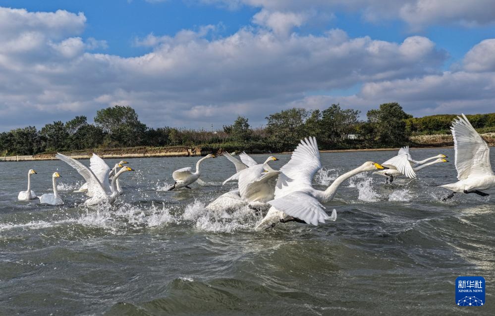 10月18日,首批越冬大天鹅在天鹅湖戏水、觅食。