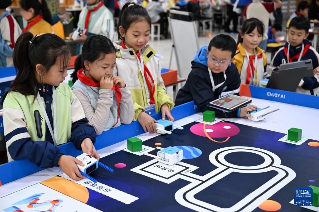 10月18日,学生在西安市新城区太华路小学参加人工智能创意编程挑战赛。