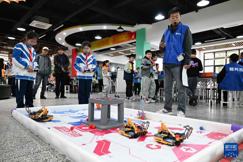 10月18日,学生在西安市新城区太华路小学参加机器人挑战赛。