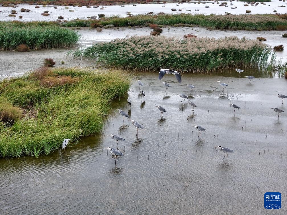 10月18日,一群候鸟在江苏省连云港市海州湾国家级海洋公园湿地栖息、觅食(无人机照片)。