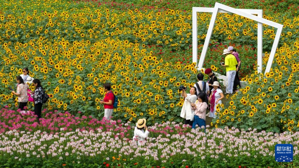 10月17日,游客在江苏省昆山市开发区慧聚花海赏花游玩(无人机照片)。