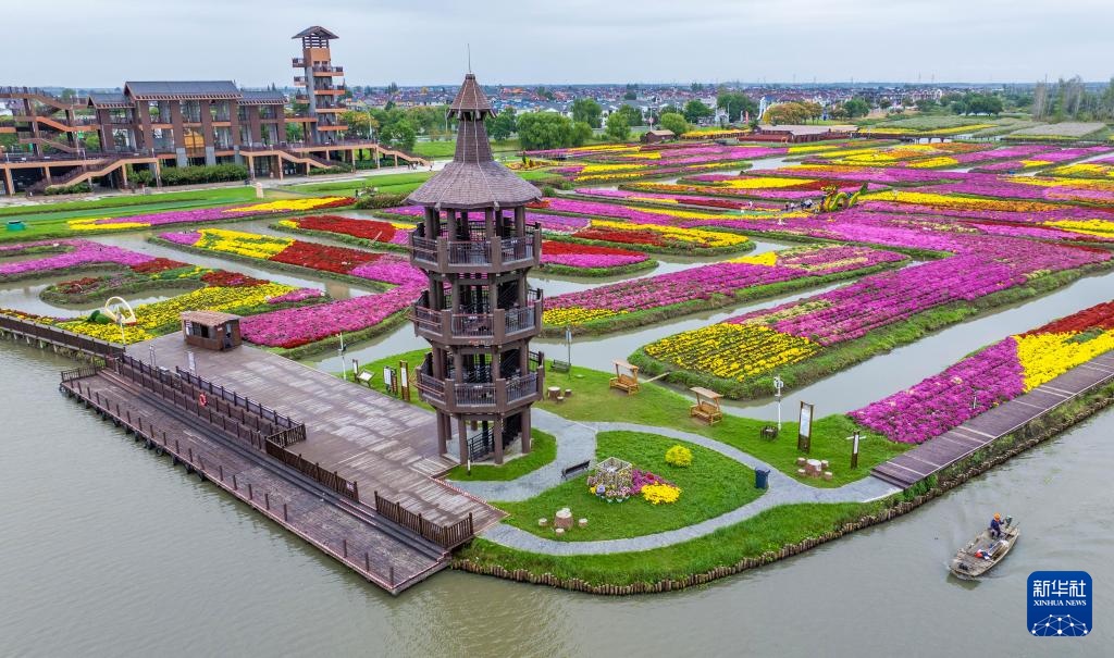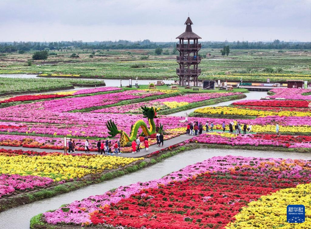 10月17日,游客在江苏省兴化市千垛景区赏菊游玩(无人机照片)。