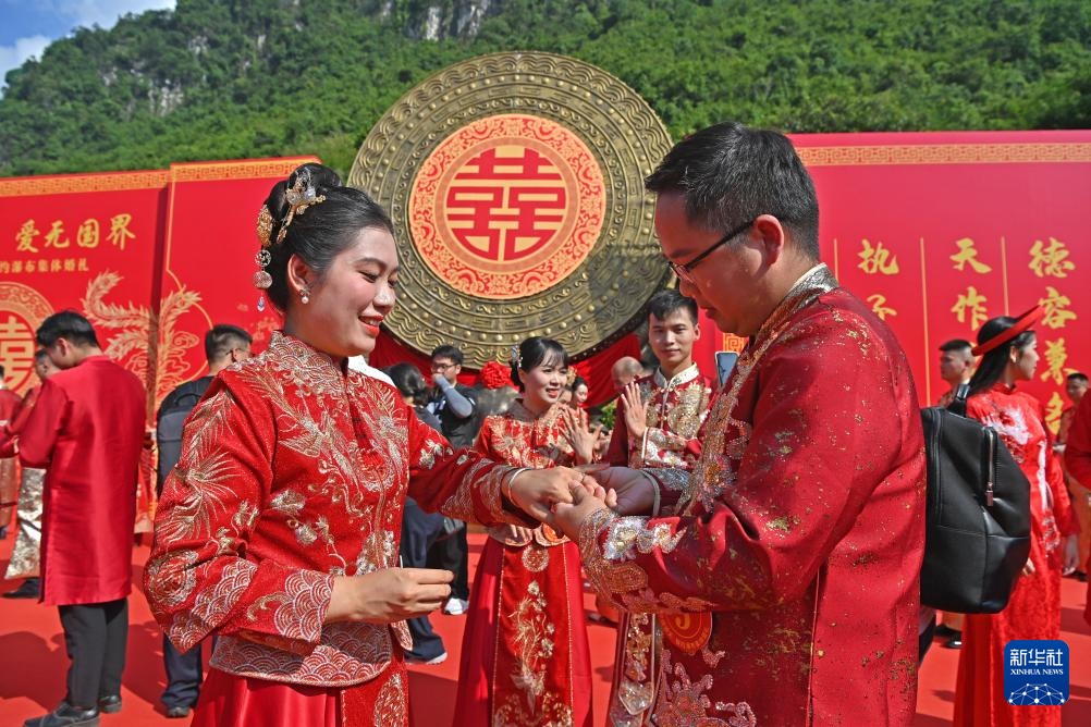 10月18日,“会聚良缘 爱无国界”中越德天(板约)瀑布集体婚礼在广西大新县中越德天(板约)瀑布跨境旅游合作区举行,中越两国39对夫妻参与,除新婚夫妻外,还有金婚、银婚夫妻参与活动。