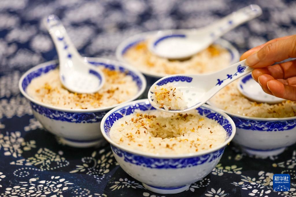 10月14日,工作人员在安徽省黄山市徽州区呈坎镇灵山村制作桂花酒酿。