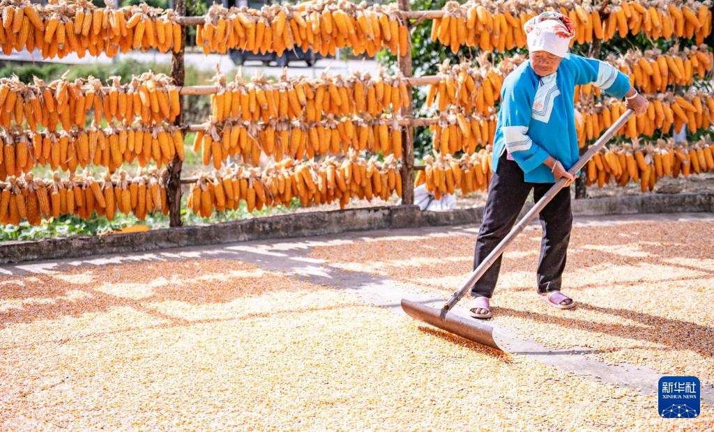10月11日,云南省文山壮族苗族自治州广南县莲城镇那朵村农民在屋前晾晒收获的玉米。